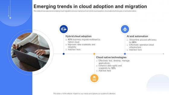 This slide showcases trends shaping cloud migration services market such as hybrid cloud adoption, cloud native technologies, AI and automation. Crafting an eye-catching presentation has never been more straightforward. Let your presentation shine with this tasteful yet straightforward Effective Data Migration Emerging Trends In Cloud Adoption And Migration template. It offers a minimalistic and classy look that is great for making a statement. The colors have been employed intelligently to add a bit of playfulness while still remaining professional. Construct the ideal Effective Data Migration Emerging Trends In Cloud Adoption And Migration that effortlessly grabs the attention of your audience Begin now and be certain to wow your customers This slide showcases trends shaping cloud migration services market such as hybrid cloud adoption, cloud native technologies, AI and automation.