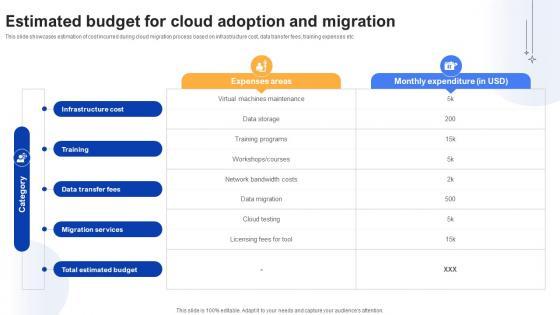 This slide showcases estimation of cost incurred during cloud migration process based on infrastructure cost, data transfer fees, training expenses etc. Make sure to capture your audiences attention in your business displays with our gratis customizable Effective Data Migration Estimated Budget For Cloud Adoption And Migration. These are great for business strategies, office conferences, capital raising or task suggestions. If you desire to acquire more customers for your tech business and ensure they stay satisfied, create your own sales presentation with these plain slides. This slide showcases estimation of cost incurred during cloud migration process based on infrastructure cost, data transfer fees, training expenses etc.