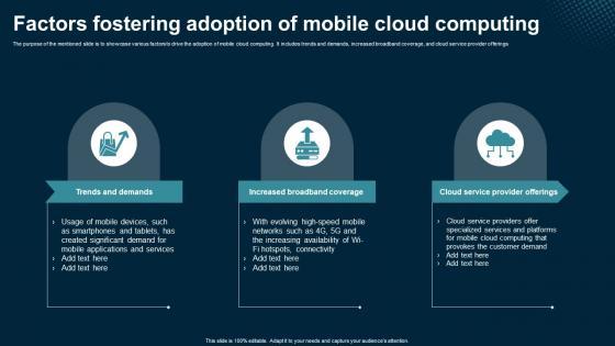 The purpose of the mentioned slide is to showcase various factors to drive the adoption of mobile cloud computing. It includes trends and demands, increased broadband coverage, and cloud service provider offerings. Whether you have daily or monthly meetings, a brilliant presentation is necessary. Factors Fostering Adoption Of Mobile Cloud Application Areas Of Mobile Cloud Computing can be your best option for delivering a presentation. Represent everything in detail using Factors Fostering Adoption Of Mobile Cloud Application Areas Of Mobile Cloud Computing and make yourself stand out in meetings. The template is versatile and follows a structure that will cater to your requirements. All the templates prepared by Slidegeeks are easy to download and edit. Our research experts have taken care of the corporate themes as well. So, give it a try and see the results. The purpose of the mentioned slide is to showcase various factors to drive the adoption of mobile cloud computing. It includes trends and demands, increased broadband coverage, and cloud service provider offerings