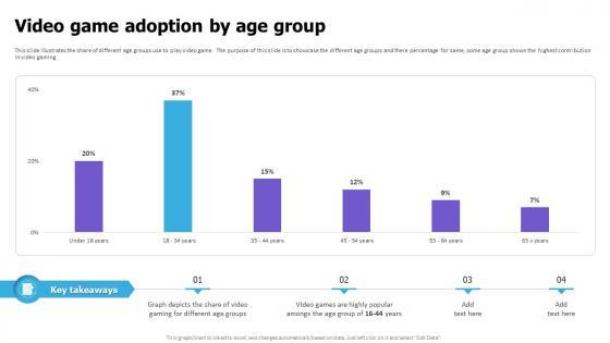 This slide illustrates the share of different age groups use to play video game. The purpose of this slide is to showcase the different age groups and there percentage for same, some age group shown the highest contribution in video gaming. The best PPT templates are a great way to save time, energy, and resources. Slidegeeks have 100 percent editable powerpoint slides making them incredibly versatile. With these quality presentation templates, you can create a captivating and memorable presentation by combining visually appealing slides and effectively communicating your message. Download Video Game Adoption By Age Group Cloud Game Development Fundraising Pitch Deck from Slidegeeks and deliver a wonderful presentation. This slide illustrates the share of different age groups use to play video game. The purpose of this slide is to showcase the different age groups and there percentage for same, some age group shown the highest contribution in video gaming.