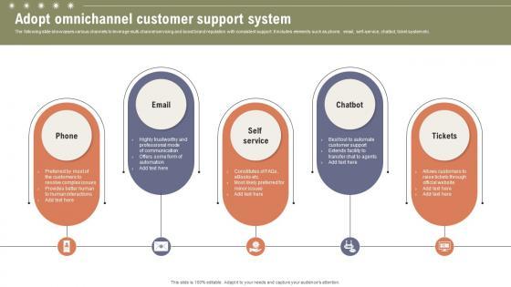 The following slide showcases various channels to leverage multi-channel servicing and boost brand reputation with consistent support. It includes elements such as phone, email, self-service, chatbot, ticket system etc. The following slide showcases various channels to leverage multi-channel servicing and boost brand reputation with consistent support. It includes elements such as phone, email, self-service, chatbot, ticket system etc. Find a pre-designed and impeccable Adopt Omnichannel Customer Support Boosting Customer Retention Rate With Live Chat. The templates can ace your presentation without additional effort. You can download these easy-to-edit presentation templates to make your presentation stand out from others. So, what are you waiting for Download the template from Slidegeeks today and give a unique touch to your presentation. The following slide showcases various channels to leverage multi-channel servicing and boost brand reputation with consistent support. It includes elements such as phone, email, self-service, chatbot, ticket system etc.