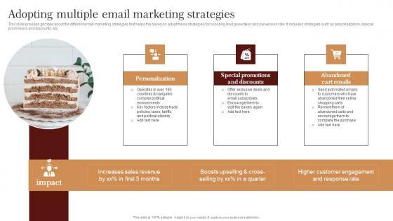 This slide provides glimpse about the different email marketing strategies that helps the bakery to adopt these strategies for boosting lead generation and conversion rate. It includes strategies such as personalization, special promotions and discounts, etc.This modern and well arranged Adopting Multiple Email Marketing Strategies Strategic Advertising Plan For Bakehouse Sample Pdf provides lots of creative possibilities. It is very simple to customize and edit with the Powerpoint Software. Just drag and drop your pictures into the shapes. All facets of this template can be edited with Powerpoint no extra software is necessary. Add your own material, put your images in the places assigned for them, adjust the colors, and then you can show your slides to the world, with an animated slide included. This slide provides glimpse about the different email marketing strategies that helps the bakery to adopt these strategies for boosting lead generation and conversion rate. It includes strategies such as personalization, special promotions and discounts, etc.