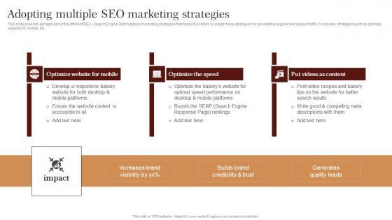 This slide provides glimpse about the different SEO Search Engine Optimization marketing strategies that helps the bakery to adopt these strategies for generating organic and unpaid traffic. It includes strategies such as optimize website for mobile, etc.This Adopting Multiple Seo Marketing Strategies Strategic Advertising Plan For Bakehouse Portrait Pdf is perfect for any presentation, be it in front of clients or colleagues. It is a versatile and stylish solution for organizing your meetings. The Adopting Multiple Seo Marketing Strategies Strategic Advertising Plan For Bakehouse Portrait Pdf features a modern design for your presentation meetings. The adjustable and customizable slides provide unlimited possibilities for acing up your presentation. Slidegeeks has done all the homework before launching the product for you. So, do not wait, grab the presentation templates today This slide provides glimpse about the different SEO Search Engine Optimization marketing strategies that helps the bakery to adopt these strategies for generating organic and unpaid traffic. It includes strategies such as optimize website for mobile, etc.