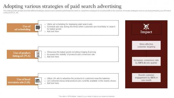 This slide provides glimpse about the different strategies of paid search advertising that helps the bakery to adopt these strategies for boosting traffic to the business. It includes strategies such as use of ad scheduling, use of Product Listing Ad PLA, etc.Explore a selection of the finest Adopting Various Strategies Of Paid Search Strategic Advertising Plan For Bakehouse Brochure Pdf here. With a plethora of professionally designed and pre made slide templates, you can quickly and easily find the right one for your upcoming presentation. You can use our Adopting Various Strategies Of Paid Search Strategic Advertising Plan For Bakehouse Brochure Pdf to effectively convey your message to a wider audience. Slidegeeks has done a lot of research before preparing these presentation templates. The content can be personalized and the slides are highly editable. Grab templates today from Slidegeeks. This slide provides glimpse about the different strategies of paid search advertising that helps the bakery to adopt these strategies for boosting traffic to the business. It includes strategies such as use of ad scheduling, use of Product Listing Ad PLA, etc.