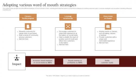 This slide provides glimpse about the different strategies of Word of Mouth WOM marketing that helps the bakery to adopt these strategies for building customer loyalty. It includes strategies such as partner marketing, influencer marketing, etc.The best PPT templates are a great way to save time, energy, and resources. Slidegeeks have 100Precent editable powerpoint slides making them incredibly versatile. With these quality presentation templates, you can create a captivating and memorable presentation by combining visually appealing slides and effectively communicating your message. Download Adopting Various Word Of Mouth Strategies Strategic Advertising Plan For Bakehouse Brochure Pdf from Slidegeeks and deliver a wonderful presentation. This slide provides glimpse about the different strategies of Word of Mouth WOM marketing that helps the bakery to adopt these strategies for building customer loyalty. It includes strategies such as partner marketing, influencer marketing, etc.