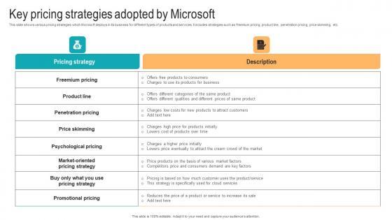 This slide shows various pricing strategies which Microsoft deploys in its business for different types of products and services. It includes strategies such as freemium pricing, product line, penetration pricing, price skimming, etc. Coming up with a presentation necessitates that the majority of the effort goes into the content and the message you intend to convey. The visuals of a PowerPoint presentation can only be effective if it supplements and supports the story that is being told. Keeping this in mind our experts created Key Pricing Strategies Adopted By Microsoft Strategic Advancements By Microsofts Demonstration Pdf to reduce the time that goes into designing the presentation. This way, you can concentrate on the message while our designers take care of providing you with the right template for the situation. This slide shows various pricing strategies which Microsoft deploys in its business for different types of products and services. It includes strategies such as freemium pricing, product line, penetration pricing, price skimming, etc.