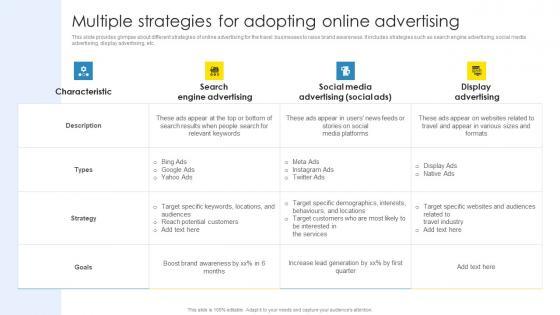 This slide provides glimpse about different strategies of online advertising for the travel businesses to raise brand awareness. It includes strategies such as search engine advertising, social media advertising, display advertising, etc. Create an editable Multiple Strategies For Adopting Online Advertising Strategic Marketing Plan Download Pdf that communicates your idea and engages your audience. Whether you are presenting a business or an educational presentation, pre-designed presentation templates help save time. Multiple Strategies For Adopting Online Advertising Strategic Marketing Plan Download Pdf is highly customizable and very easy to edit, covering many different styles from creative to business presentations. Slidegeeks has creative team members who have crafted amazing templates. So, go and get them without any delay. This slide provides glimpse about different strategies of online advertising for the travel businesses to raise brand awareness. It includes strategies such as search engine advertising, social media advertising, display advertising, etc.