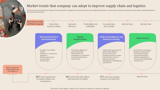 This slide covers recent trends in supply chain and logistics management. It includes trends such as digital supply chains, cybersecurity, advanced analytics and automation, artificial intelligence and machine learning, etc. Explore a selection of the finest Leveraging Logistics Automation Market Trends That Company Can Adopt Inspiration Pdf here. With a plethora of professionally designed and pre made slide templates, you can quickly and easily find the right one for your upcoming presentation. You can use our Leveraging Logistics Automation Market Trends That Company Can Adopt Inspiration Pdf to effectively convey your message to a wider audience. Slidegeeks has done a lot of research before preparing these presentation templates. The content can be personalized and the slides are highly editable. Grab templates today from Slidegeeks. This slide covers recent trends in supply chain and logistics management. It includes trends such as digital supply chains, cybersecurity, advanced analytics and automation, artificial intelligence and machine learning, etc.