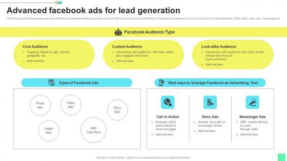 The following slide showcases overview of facebook advertisements to generate more visibility and boost number of followers. It includes elements such as core, custom, look alike audience, call to action, story ads, messenger etc. Slidegeeks is one of the best resources for PowerPoint templates. You can download easily and regulate Advanced Facebook Ads For Lead Introduction To Niche Marketing Audience Segmentation Ideas Pdf for your personal presentations from our wonderful collection. A few clicks is all it takes to discover and get the most relevant and appropriate templates. Use our Templates to add a unique zing and appeal to your presentation and meetings. All the slides are easy to edit and you can use them even for advertisement purposes. The following slide showcases overview of facebook advertisements to generate more visibility and boost number of followers. It includes elements such as core, custom, look alike audience, call to action, story ads, messenger etc.