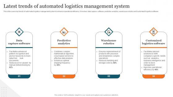 This slide covers top trends of automated logistics management system to enhance operational efficiency. It involves data capture software, predictive analytics, warehouse robotics and customized logistics software. Crafting an eye catching presentation has never been more straightforward. Let your presentation shine with this tasteful yet straightforward Latest Trends Of Automated Advanced Supply Chain Improvement Strategies Designs Pdf template. It offers a minimalistic and classy look that is great for making a statement. The colors have been employed intelligently to add a bit of playfulness while still remaining professional. Construct the ideal Latest Trends Of Automated Advanced Supply Chain Improvement Strategies Designs Pdf that effortlessly grabs the attention of your audience Begin now and be certain to wow your customers This slide covers top trends of automated logistics management system to enhance operational efficiency. It involves data capture software, predictive analytics, warehouse robotics and customized logistics software.