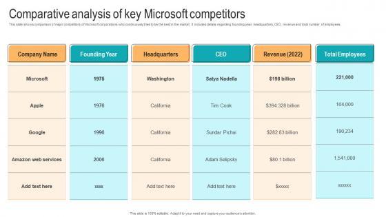 This slide shows comparison of major competitors of Microsoft corporations who continuously tries to be the best in the market. It includes details regarding founding year, headquarters, CEO, revenue and total number of employees. Get a simple yet stunning designed Comparative Analysis Of Key Microsoft Strategic Advancements By Microsofts Themes Pdf. It is the best one to establish the tone in your meetings. It is an excellent way to make your presentations highly effective. So, download this PPT today from Slidegeeks and see the positive impacts. Our easy-to-edit Comparative Analysis Of Key Microsoft Strategic Advancements By Microsofts Themes Pdf can be your go-to option for all upcoming conferences and meetings. So, what are you waiting for Grab this template today. This slide shows comparison of major competitors of Microsoft corporations who continuously tries to be the best in the market. It includes details regarding founding year, headquarters, CEO, revenue and total number of employees.