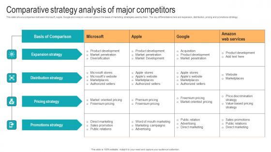 This slide shows comparison between Microsoft, Apple, Google and Amazon web services on the basis of marketing strategies used by them. The key differentiators here are expansion, distribution, pricing and promotions strategy. Present like a pro with Comparative Strategy Analysis Of Major Strategic Advancements By Microsofts Rules Pdf Create beautiful presentations together with your team, using our easy-to-use presentation slides. Share your ideas in real-time and make changes on the fly by downloading our templates. So whether you are in the office, on the go, or in a remote location, you can stay in sync with your team and present your ideas with confidence. With Slidegeeks presentation got a whole lot easier. Grab these presentations today. This slide shows comparison between Microsoft, Apple, Google and Amazon web services on the basis of marketing strategies used by them. The key differentiators here are expansion, distribution, pricing and promotions strategy.