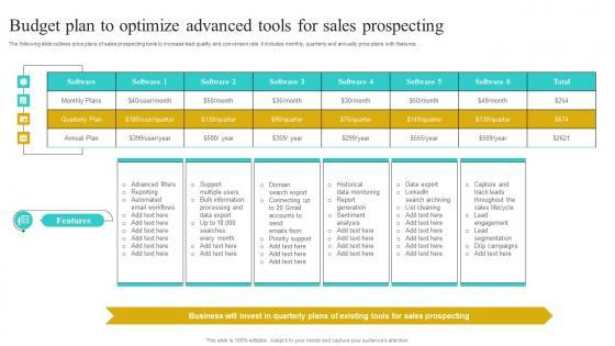 The following slide outlines price plans of sales prospecting tools to increase lead quality and conversion rate. It includes monthly, quarterly and annually price plans with features.Create an editable Budget Plan To Optimize Advanced Tools Implementing Strategies To Improve Information Pdf that communicates your idea and engages your audience. Whether you are presenting a business or an educational presentation, pre-designed presentation templates help save time. Budget Plan To Optimize Advanced Tools Implementing Strategies To Improve Information Pdf is highly customizable and very easy to edit, covering many different styles from creative to business presentations. Slidegeeks has creative team members who have crafted amazing templates. So, go and get them without any delay. The following slide outlines price plans of sales prospecting tools to increase lead quality and conversion rate. It includes monthly, quarterly and annually price plans with features.