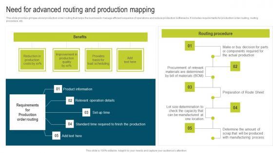 This slide provides glimpse about production order routing that helps the business to manage efficient sequence of operations and reduce production bottlenecks. It includes requirements for production order routing, routing procedure, etc.Are you in need of a template that can accommodate all of your creative concepts This one is crafted professionally and can be altered to fit any style. Use it with Google Slides or PowerPoint. Include striking photographs, symbols, depictions, and other visuals. Fill, move around, or remove text boxes as desired. Test out color palettes and font mixtures. Edit and save your work, or work with colleagues. Download Need For Advanced Routing And Mapping Production Quality Administration Information Pdf and observe how to make your presentation outstanding. Give an impeccable presentation to your group and make your presentation unforgettable. This slide provides glimpse about production order routing that helps the business to manage efficient sequence of operations and reduce production bottlenecks. It includes requirements for production order routing, routing procedure, etc.