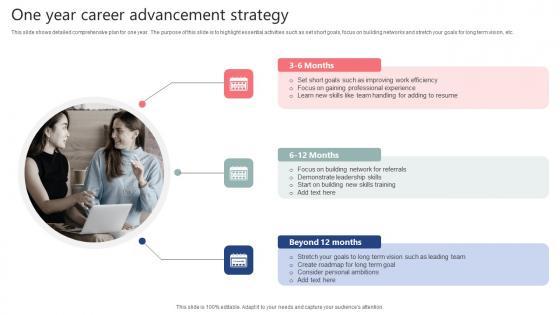 This slide shows detailed comprehensive plan for one year. The purpose of this slide is to highlight essential activities such as set short goals, focus on building networks and stretch your goals for long term vision, etc. Showcasing this set of slides titled One Year Career Advancement Strategy Information Pdf. The topics addressed in these templates are Skills Like, Demonstrate Leadership Skills, Consider Personal Ambitions. All the content presented in this PPT design is completely editable. Download it and make adjustments in color, background, font etc. as per your unique business setting. This slide shows detailed comprehensive plan for one year. The purpose of this slide is to highlight essential activities such as set short goals, focus on building networks and stretch your goals for long term vision, etc.
