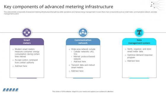This slide exhibits components of advanced metering infrastructure that optimize utility operations and improve energy management. It covers there main components such as smart meter, communication network, and data management system. Do you have to make sure that everyone on your team knows about any specific topic I yes, then you should give Empowering The Future Key Components Of Advanced Metering Infrastructure IoT SS V a try. Our experts have put a lot of knowledge and effort into creating this impeccable Empowering The Future Key Components Of Advanced Metering Infrastructure IoT SS V. You can use this template for your upcoming presentations, as the slides are perfect to represent even the tiniest detail. You can download these templates from the Slidegeeks website and these are easy to edit. So grab these today This slide exhibits components of advanced metering infrastructure that optimize utility operations and improve energy management. It covers there main components such as smart meter, communication network, and data management system.