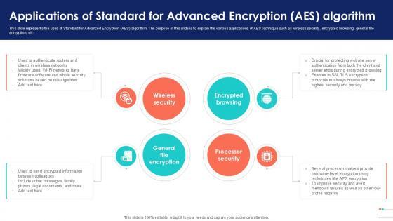 This slide represents the uses of Standard for Advanced Encryption AES algorithm. The purpose of this slide is to explain the various applications of AES technique such as wireless security, encrypted browsing, general file encryption, etc. If your project calls for a presentation, then Slidegeeks is your go to partner because we have professionally designed, easy to edit templates that are perfect for any presentation. After downloading, you can easily edit Applications Of Standard Advanced Cloud Data Security Using Cryptography Topics Pdf and make the changes accordingly. You can rearrange slides or fill them with different images. Check out all the handy templates This slide represents the uses of Standard for Advanced Encryption AES algorithm. The purpose of this slide is to explain the various applications of AES technique such as wireless security, encrypted browsing, general file encryption, etc.