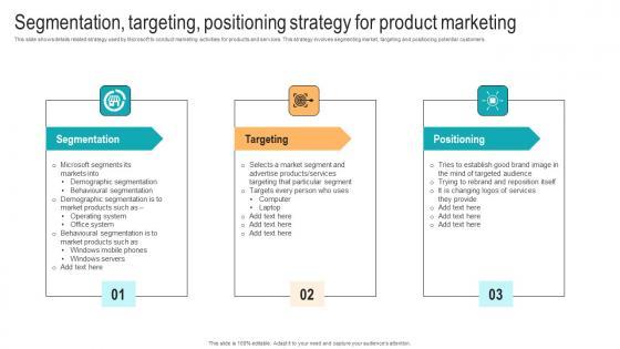 This slide shows details related strategy used by Microsoft to conduct marketing activities for products and services. This strategy involves segmenting market, targeting and positioning potential customers. Do you have to make sure that everyone on your team knows about any specific topic I yes, then you should give Segmentation Targeting Positioning Strategic Advancements By Microsofts Guidelines Pdf a try. Our experts have put a lot of knowledge and effort into creating this impeccable Segmentation Targeting Positioning Strategic Advancements By Microsofts Guidelines Pdf. You can use this template for your upcoming presentations, as the slides are perfect to represent even the tiniest detail. You can download these templates from the Slidegeeks website and these are easy to edit. So grab these today This slide shows details related strategy used by Microsoft to conduct marketing activities for products and services. This strategy involves segmenting market, targeting and positioning potential customers.