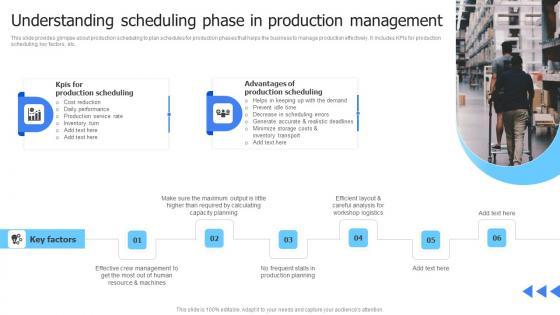 This slide provides glimpse about production scheduling to plan schedules for production phases that helps the business to manage production effectively. It includes KPIs for production scheduling, key factors, etc. The Leveraging Advanced Manufacturing Understanding Scheduling Phase In Production Template Pdf is a compilation of the most recent design trends as a series of slides. It is suitable for any subject or industry presentation, containing attractive visuals and photo spots for businesses to clearly express their messages. This template contains a variety of slides for the user to input data, such as structures to contrast two elements, bullet points, and slides for written information. Slidegeeks is prepared to create an impression. This slide provides glimpse about production scheduling to plan schedules for production phases that helps the business to manage production effectively. It includes KPIs for production scheduling, key factors, etc.