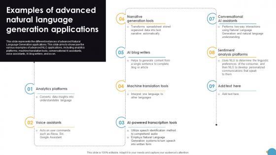 This slide represents the different instances of advanced Natural Language Generation applications. This slide aims to showcase the various examples of advanced NLG applications, including analytics platforms, machine translation tools, conversational AI assistants, voice assistants, AI blog writers, and so on. Formulating a presentation can take up a lot of effort and time, so the content and message should always be the primary focus. The visuals of the PowerPoint can enhance the presenters message, so our Examples Of Advanced Natural Language Generation Applications Natural Language Automation was created to help save time. Instead of worrying about the design, the presenter can concentrate on the message while our designers work on creating the ideal templates for whatever situation is needed. Slidegeeks has experts for everything from amazing designs to valuable content, we have put everything into Examples Of Advanced Natural Language Generation Applications Natural Language Automation This slide represents the different instances of advanced Natural Language Generation applications. This slide aims to showcase the various examples of advanced NLG applications, including analytics platforms, machine translation tools, conversational AI assistants, voice assistants, AI blog writers, and so on.