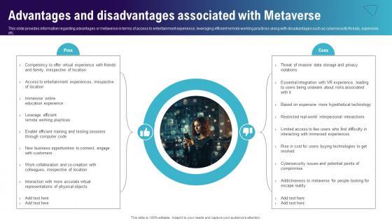 This slide provides information regarding advantages or metaverse in terms of access to entertainment experience, leveraging efficient remote working practices along with disadvantages such as cybersecurity threats, expensive, etc. Whether you have daily or monthly meetings, a brilliant presentation is necessary. Advantages And Disadvantages Associated Continuum Of Technology Revamping Business AI SS V can be your best option for delivering a presentation. Represent everything in detail using Advantages And Disadvantages Associated Continuum Of Technology Revamping Business AI SS V and make yourself stand out in meetings. The template is versatile and follows a structure that will cater to your requirements. All the templates prepared by Slidegeeks are easy to download and edit. Our research experts have taken care of the corporate themes as well. So, give it a try and see the results. This slide provides information regarding advantages or metaverse in terms of access to entertainment experience, leveraging efficient remote working practices along with disadvantages such as cybersecurity threats, expensive, etc.