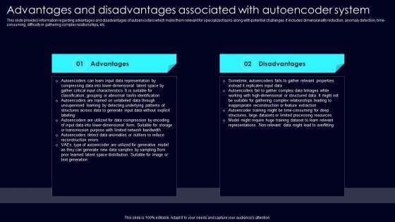 This slide provides information regarding advantages and disadvantages of autoencoders which make them relevant for specialized tasks along with potential challenges. It includes dimensionality reduction, anomaly detection, time-consuming, difficulty in gathering complex relationships, etc. Boost your pitch with our creative Advantages And Disadvantages Associated Generative AI For Better Productivity AI SS V. Deliver an awe-inspiring pitch that will mesmerize everyone. Using these presentation templates you will surely catch everyones attention. You can browse the ppts collection on our website. We have researchers who are experts at creating the right content for the templates. So you do not have to invest time in any additional work. Just grab the template now and use them. This slide provides information regarding advantages and disadvantages of autoencoders which make them relevant for specialized tasks along with potential challenges. It includes dimensionality reduction, anomaly detection, time-consuming, difficulty in gathering complex relationships, etc.