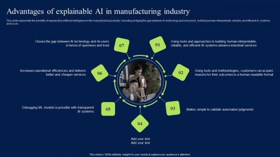 This slide represents the benefits of explainable artificial intelligence in the manufacturing industry, including bridging the gap between AI technology and end users, building human-interpretable, reliable, and efficient AI systems, and so on. Make sure to capture your audiences attention in your business displays with our gratis customizable Advantages Of Explainable AI In Manufacturing Industry Structure PDF. These are great for business strategies, office conferences, capital raising or task suggestions. If you desire to acquire more customers for your tech business and ensure they stay satisfied, create your own sales presentation with these plain slides.