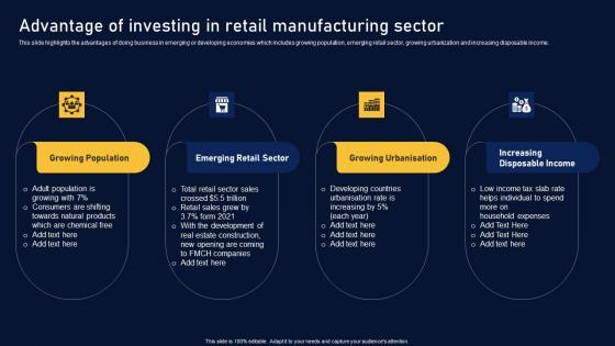 This slide highlights the advantages of doing business in emerging or developing economies which includes growing population, emerging retail sector, growing urbanization and increasing disposable income. Boost your pitch with our creative Customer Goods Production Advantage Of Investing In Retail Manufacturing Sector Structure PDF. Deliver an awe-inspiring pitch that will mesmerize everyone. Using these presentation templates you will surely catch everyones attention. You can browse the ppts collection on our website. We have researchers who are experts at creating the right content for the templates. So you dont have to invest time in any additional work. Just grab the template now and use them.