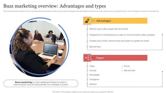 This slide showcases overview of buzz marketing which businesses can refer to plan unique campaigns. It provides details about word of mouth, customer base, recognition, taboo, secret, outrageous, hilarious, remarkable, etc. Do you have to make sure that everyone on your team knows about any specific topic I yes, then you should give Buzz Marketing Overview Advantages And Types Organizing Buzzworthy Social Portrait Pdf a try. Our experts have put a lot of knowledge and effort into creating this impeccable Buzz Marketing Overview Advantages And Types Organizing Buzzworthy Social Portrait Pdf You can use this template for your upcoming presentations, as the slides are perfect to represent even the tiniest detail. You can download these templates from the Slidegeeks website and these are easy to edit. So grab these today. This slide showcases overview of buzz marketing which businesses can refer to plan unique campaigns. It provides details about word of mouth, customer base, recognition, taboo, secret, outrageous, hilarious, remarkable, etc.