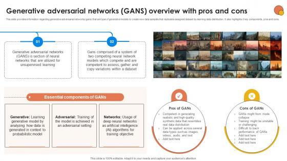 This slide provides information regarding generative adversarial networks gans that are type of generative models to create new data samples that replicates assigned dataset by learning data distribution. It also highlights it key components, pros and cons. Are you in need of a template that can accommodate all of your creative concepts This one is crafted professionally and can be altered to fit any style. Use it with Google Slides or PowerPoint. Include striking photographs, symbols, depictions, and other visuals. Fill, move around, or remove text boxes as desired. Test out color palettes and font mixtures. Edit and save your work, or work with colleagues. Download Generative Adversarial Networks GANS Generative AI For Better Productivity AI SS V and observe how to make your presentation outstanding. Give an impeccable presentation to your group and make your presentation unforgettable. This slide provides information regarding generative adversarial networks gans that are type of generative models to create new data samples that replicates assigned dataset by learning data distribution. It also highlights it key components, pros and cons.