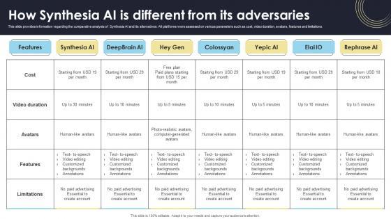 This slide provides information regarding the comparative analysis of Synthesia AI and its alternatives. All platforms were assessed on various parameters such as cost, video duration, avatars, features and limitations. Find a pre-designed and impeccable How Synthesia AI Is Different From Its Adversaries How Generative AI Tools Work AI SS V. The templates can ace your presentation without additional effort. You can download these easy-to-edit presentation templates to make your presentation stand out from others. So, what are you waiting for Download the template from Slidegeeks today and give a unique touch to your presentation. This slide provides information regarding the comparative analysis of Synthesia AI and its alternatives. All platforms were assessed on various parameters such as cost, video duration, avatars, features and limitations.