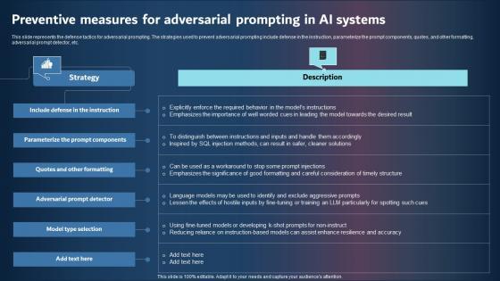 This slide represents the defense tactics for adversarial prompting. The strategies used to prevent adversarial prompting include defense in the instruction, parameterize the prompt components, quotes, and other formatting, adversarial prompt detector, etc. Take your projects to the next level with our ultimate collection of Preventive Measures For Adversarial Prompting In AI Systems Graphics Pdf. Slidegeeks has designed a range of layouts that are perfect for representing task or activity duration, keeping track of all your deadlines at a glance. Tailor these designs to your exact needs and give them a truly corporate look with your own brand colors they will make your projects stand out from the rest This slide represents the defense tactics for adversarial prompting. The strategies used to prevent adversarial prompting include defense in the instruction, parameterize the prompt components, quotes, and other formatting, adversarial prompt detector, etc.