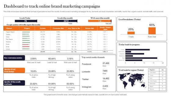 This slide showcases dashboard that can help organization to track the results of online brand marketing campaigns. Its key elements are leads breakdown, web traffic, lead to trial, organic search, website traffic, web users etc. If you are looking for a format to display your unique thoughts, then the professionally designed Dashboard To Track Online Brand Marketing Product Advertising And Positioning Graphics Pdf is the one for you. You can use it as a Google Slides template or a PowerPoint template. Incorporate impressive visuals, symbols, images, and other charts. Modify or reorganize the text boxes as you desire. Experiment with shade schemes and font pairings. Alter, share or cooperate with other people on your work. Download Dashboard To Track Online Brand Marketing Product Advertising And Positioning Graphics Pdf and find out how to give a successful presentation. Present a perfect display to your team and make your presentation unforgettable. This slide showcases dashboard that can help organization to track the results of online brand marketing campaigns. Its key elements are leads breakdown, web traffic, lead to trial, organic search, website traffic, web users etc.