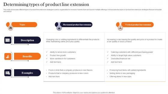 This slide showcases different types of product line extension strategies used by organization to increase market share and launch multiple offerings. It showcases two types of product line extension strategies that are horizontal and vertical. Formulating a presentation can take up a lot of effort and time, so the content and message should always be the primary focus. The visuals of the PowerPoint can enhance the presenters message, so our Determining Types Of Product Line Extension Product Advertising And Positioning Slides Pdf was created to help save time. Instead of worrying about the design, the presenter can concentrate on the message while our designers work on creating the ideal templates for whatever situation is needed. Slidegeeks has experts for everything from amazing designs to valuable content, we have put everything into Determining Types Of Product Line Extension Product Advertising And Positioning Slides Pdf This slide showcases different types of product line extension strategies used by organization to increase market share and launch multiple offerings. It showcases two types of product line extension strategies that are horizontal and vertical.