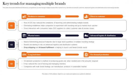 This slide showcases latest trends followed by companies to run and manage multiple brands in the market. Its key elements are direct to customer, advanced logistics and distribution and on demand production. The best PPT templates are a great way to save time, energy, and resources. Slidegeeks have 100 percent editable powerpoint slides making them incredibly versatile. With these quality presentation templates, you can create a captivating and memorable presentation by combining visually appealing slides and effectively communicating your message. Download Key Trends For Managing Multiple Brands Product Advertising And Positioning Rules Pdf from Slidegeeks and deliver a wonderful presentation. This slide showcases latest trends followed by companies to run and manage multiple brands in the market. Its key elements are direct to customer, advanced logistics and distribution and on demand production.