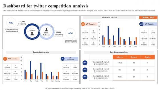 This slide represents the dashboard for twitter competition analysis providing information regarding published tweets in terms of original, links, pictures, videos etc. It also covers details of tweet likes, retweets, mentions, replies etc. Get a simple yet stunning designed Digital Advertising Using Twitter Dashboard For Twitter Competition Analysis Information Pdf. It is the best one to establish the tone in your meetings. It is an excellent way to make your presentations highly effective. So, download this PPT today from Slidegeeks and see the positive impacts. Our easy to edit Digital Advertising Using Twitter Dashboard For Twitter Competition Analysis Information Pdf can be your go to option for all upcoming conferences and meetings. So, what are you waiting for Grab this template today. This slide represents the dashboard for twitter competition analysis providing information regarding published tweets in terms of original, links, pictures, videos etc. It also covers details of tweet likes, retweets, mentions, replies etc.