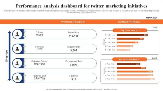 This slide represents the dashboard to analysis the performance of twitter advertising campaign. It provides information regarding total followers gained and lost, impressions, engagement rate. It also covers details of top five used and best performing hashtags performance. Crafting an eye catching presentation has never been more straightforward. Let your presentation shine with this tasteful yet straightforward Digital Advertising Using Twitter Performance Analysis Dashboard For Twitter Marketing Topics Pdf template. It offers a minimalistic and classy look that is great for making a statement. The colors have been employed intelligently to add a bit of playfulness while still remaining professional. Construct the ideal Digital Advertising Using Twitter Performance Analysis Dashboard For Twitter Marketing Topics Pdf that effortlessly grabs the attention of your audience Begin now and be certain to wow your customers This slide represents the dashboard to analysis the performance of twitter advertising campaign. It provides information regarding total followers gained and lost, impressions, engagement rate. It also covers details of top five used and best performing hashtags performance.