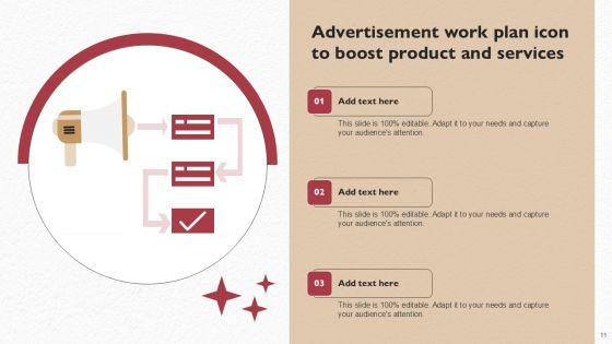 Improve your presentation delivery using this Advertisement Work Plan Ppt PowerPoint Presentation Complete Deck With Slides. Support your business vision and objectives using this well-structured PPT deck. This template offers a great starting point for delivering beautifully designed presentations on the topic of your choice. Comprising twelve this professionally designed template is all you need to host discussion and meetings with collaborators. Each slide is self-explanatory and equipped with high-quality graphics that can be adjusted to your needs. Therefore, you will face no difficulty in portraying your desired content using this PPT slideshow. This PowerPoint slideshow contains every important element that you need for a great pitch. It is not only editable but also available for immediate download and utilization. The color, font size, background, shapes everything can be modified to create your unique presentation layout. Therefore, download it now.