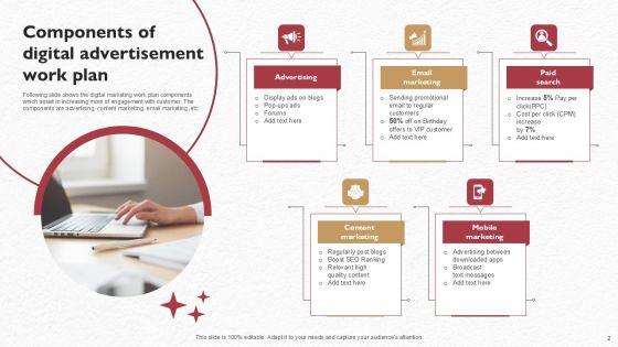 Following slide shows the digital marketing work plan components which assist in increasing more of engagement with customer. The components are advertising, content marketing, email marketing ,etc. Persuade your audience using this Components Of Digital Advertisement Work Plan Brochure PDF. This PPT design covers five stages, thus making it a great tool to use. It also caters to a variety of topics including Advertising, Email Marketing, Paid Search. Download this PPT design now to present a convincing pitch that not only emphasizes the topic but also showcases your presentation skills.