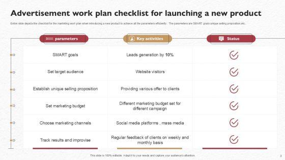 Entire slide depicts the checklist for the marketing work plan when introducing a new product to achieve all the parameters efficiently. The parameters are SMART goals unique selling proposition,etc.. Showcasing this set of slides titled Advertisement Work Plan Checklist For Launching A New Product Rules PDF. The topics addressed in these templates are Parameters, Key Activities, Status . All the content presented in this PPT design is completely editable. Download it and make adjustments in color, background, font etc. as per your unique business setting.