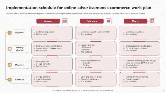 This slides outlines the unique internet marketing and e commerce work plans implementation schedule which assist in faster buying process. It includes objectives, activity planned, measures, channels. Pitch your topic with ease and precision using this Implementation Schedule For Online Advertisement Ecommerce Work Plan Formats PDF. This layout presents information on Objectives, Activity Planned, Measure. It is also available for immediate download and adjustment. So, changes can be made in the color, design, graphics or any other component to create a unique layout.
