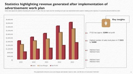 Entire slide depicts the statistics illustrating the amount of money that was made once the marketing work plan was implemented which assist in meeting up the objectives. It covers the period from2018 to 2023 Pitch your topic with ease and precision using this Statistics Highlighting Revenue Generated After Implementation Of Advertisement Work Plan Professional PDF. This layout presents information on Key Insights, Work Plan, Statistics. It is also available for immediate download and adjustment. So, changes can be made in the color, design, graphics or any other component to create a unique layout.