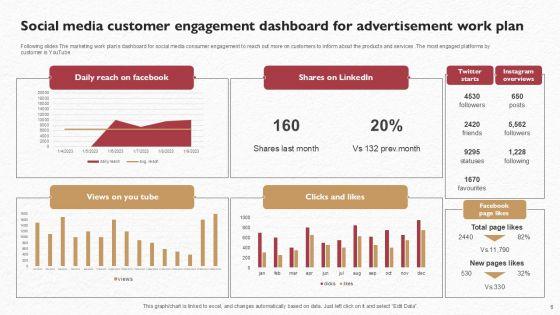 Following slides The marketing work plans dashboard for social media consumer engagement to reach out more on customers to inform about the products and services .The most engaged platforms by customer is YouTube Showcasing this set of slides titled Social Media Customer Engagement Dashboard For Advertisement Work Plan Clipart PDF. The topics addressed in these templates are Work Plan, Social Media, Engagement. All the content presented in this PPT design is completely editable. Download it and make adjustments in color, background, font etc. as per your unique business setting.