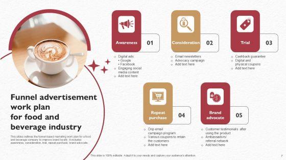 This slides outlines the funnel-based marketing work plan for a food and beverage company to improve brand loyalty. It includes awareness, consideration, trial, repeat purchase, brand advocate. Showcasing this set of slides titled Funnel Advertisement Work Plan For Food And Beverage Industry Slides PDF. The topics addressed in these templates are Awareness, Consideration, Trial. All the content presented in this PPT design is completely editable. Download it and make adjustments in color, background, font etc. as per your unique business setting.