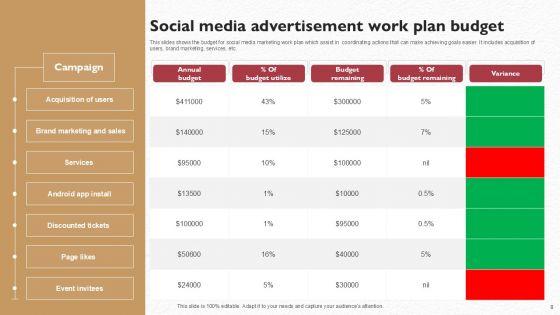 This slides shows the budget for social media marketing work plan which assist in coordinating actions that can make achieving goals easier. It includes acquisition of users, brand marketing, services, etc. Showcasing this set of slides titled Social Media Advertisement Work Plan Budget Infographics PDF. The topics addressed in these templates are Campaign, Annual Budget, Budget Remaining . All the content presented in this PPT design is completely editable. Download it and make adjustments in color, background, font etc. as per your unique business setting.