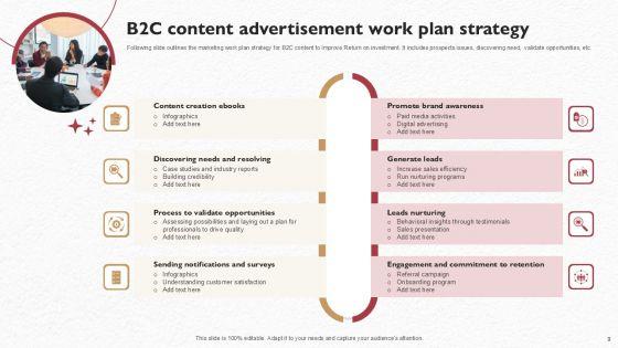 Following slide outlines the marketing work plan strategy for B2C content to improve Return on investment. It includes prospects issues, discovering need, validate opportunities, etc. Presenting B2c Content Advertisement Work Plan Strategy Microsoft PDF to dispense important information. This template comprises six stages. It also presents valuable insights into the topics including Opportunities, Resolving, Content Creation. This is a completely customizable PowerPoint theme that can be put to use immediately. So, download it and address the topic impactfully.