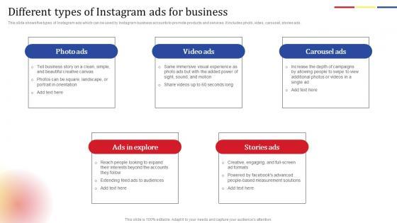 This slide shows five types of Instagram ads which can be used by Instagram business accounts to promote products and services. It includes photo, video, carousel, stories ads. Present like a pro with Different Types Of Instagram Ads For Business Online Advertising Solutions Template Pdf Create beautiful presentations together with your team, using our easy-to-use presentation slides. Share your ideas in real-time and make changes on the fly by downloading our templates. So whether you are in the office, on the go, or in a remote location, you can stay in sync with your team and present your ideas with confidence. With Slidegeeks presentation got a whole lot easier. Grab these presentations today. This slide shows five types of Instagram ads which can be used by Instagram business accounts to promote products and services. It includes photo, video, carousel, stories ads.