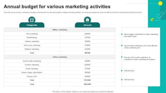 This slide can be used by marketing managers or finance team to allocate budget to multiple marketing activities. It incudes two categories which are offline and online marketing along with the amount. Slidegeeks is one of the best resources for PowerPoint templates. You can download easily and regulate One On One Advertising Annual Budget For Various Marketing Activities Strategy SS V for your personal presentations from our wonderful collection. A few clicks is all it takes to discover and get the most relevant and appropriate templates. Use our Templates to add a unique zing and appeal to your presentation and meetings. All the slides are easy to edit and you can use them even for advertisement purposes. This slide can be used by marketing managers or finance team to allocate budget to multiple marketing activities. It incudes two categories which are offline and online marketing along with the amount.