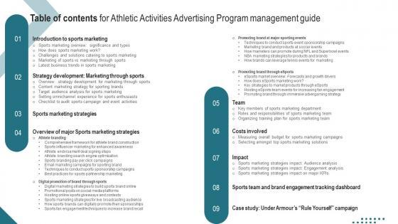 Do you have an important presentation coming up Are you looking for something that will make your presentation stand out from the rest Look no further than Table Of Contents For Athletic Activities Advertising Program Management Guide Inspiration Pdf. With our professional designs, you can trust that your presentation will pop and make delivering it a smooth process. And with Slidegeeks, you can trust that your presentation will be unique and memorable. So why wait Grab Table Of Contents For Athletic Activities Advertising Program Management Guide Inspiration Pdf today and make your presentation stand out from the rest. Our Table Of Contents For Athletic Activities Advertising Program Management Guide Inspiration Pdf are topically designed to provide an attractive backdrop to any subject. Use them to look like a presentation pro.