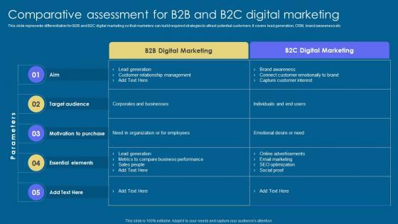 This slide represents differentiation for B2B and B2C digital marketing so that marketers can build required strategies to attract potential customers. It covers lead generation, CRM, brand awareness etc. Coming up with a presentation necessitates that the majority of the effort goes into the content and the message you intend to convey. The visuals of a PowerPoint presentation can only be effective if it supplements and supports the story that is being told. Keeping this in mind our experts created Comparative Assessment Implementation Of Digital Advertising Strategies Themes Pdf to reduce the time that goes into designing the presentation. This way, you can concentrate on the message while our designers take care of providing you with the right template for the situation. This slide represents differentiation for B2B and B2C digital marketing so that marketers can build required strategies to attract potential customers. It covers lead generation, CRM, brand awareness etc.